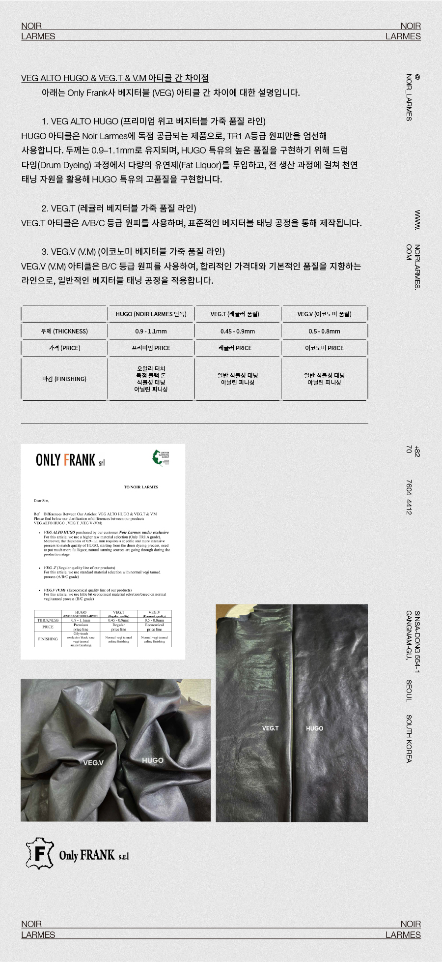 Noir Larmes에서는 이탈리아 테너리 Only Frank와의 16년간의 협업을 통해, ALTO(알토) 타입의 아티클 HUGO Vegetable Lambskin을 개발하여 독점으로 공급받고 있습니다.