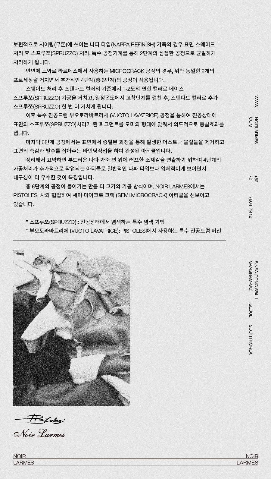 반면에 느와르 라르메스에서 사용하는 MICROCRACK 공정의 경우, 위와 동일한 2개의 프로세싱을 거치면서 추가적인 4단계(총 6단계)의 공정이 적용됩니다. 스웨이드 가공을 거치고 스탠다드 컬러의 기준에서 1-2도의 연한 컬러로 베이스 스프루쪼(SPRUZZO) 공정 처리와 일정온도에서 고착단계를 거친 후, 스탠다드 컬러로 추가 스프루쪼(SPRUZZO) 작업을 진행합니다.