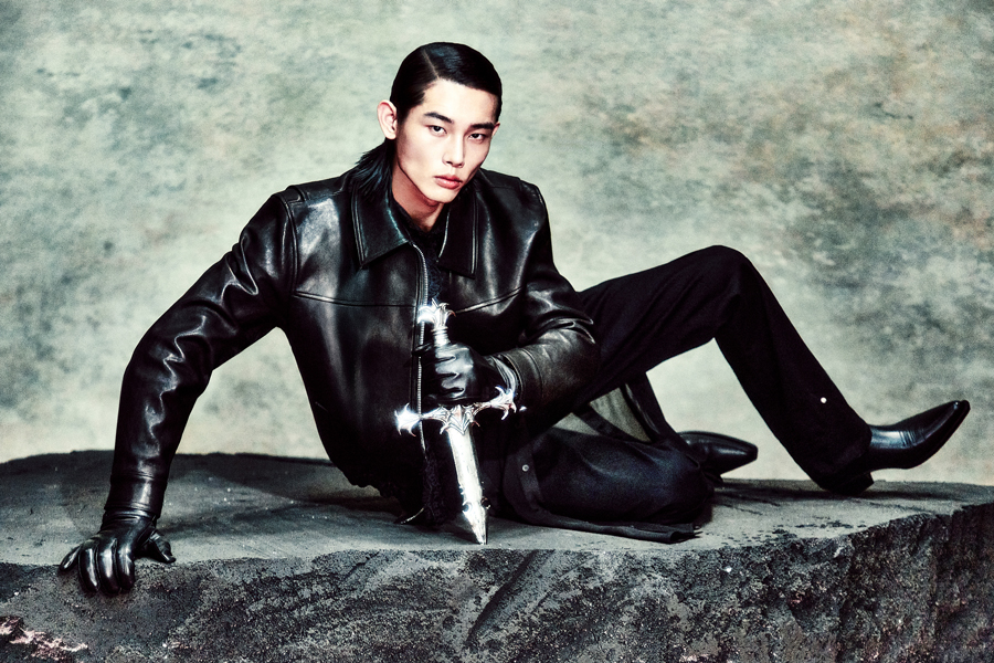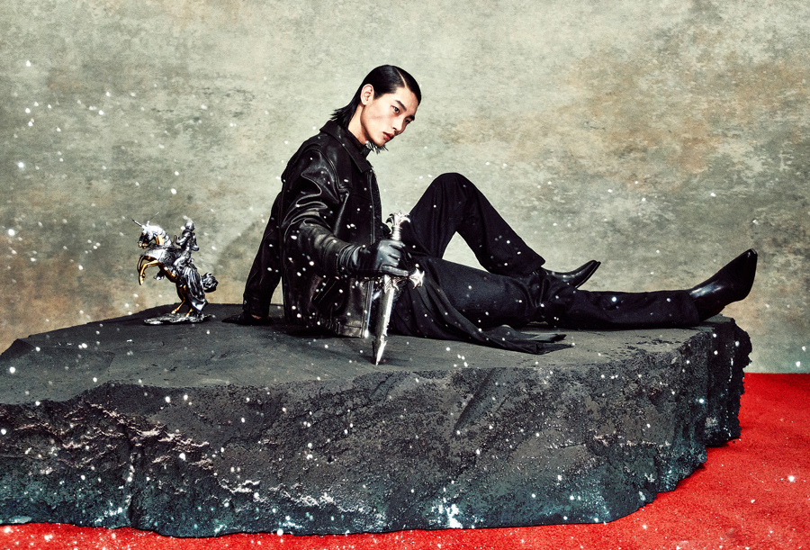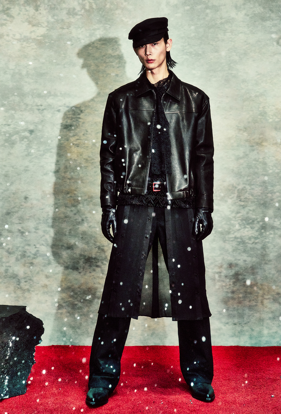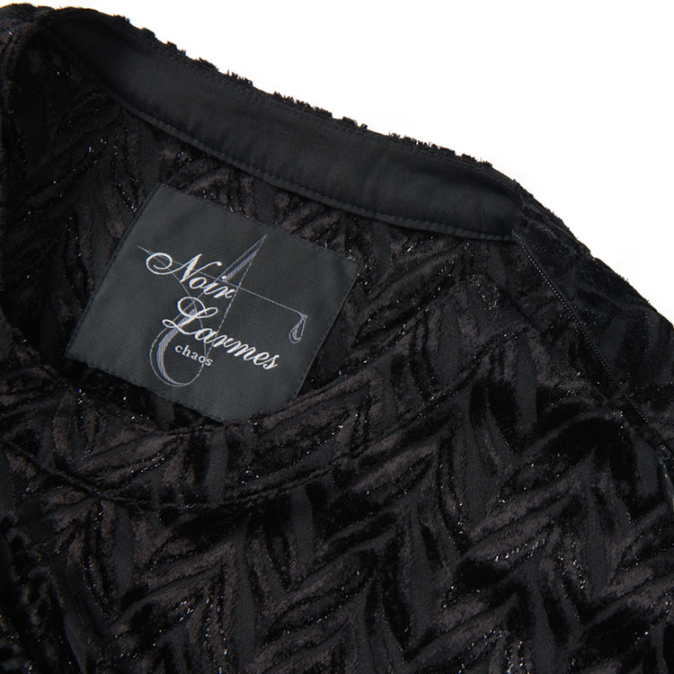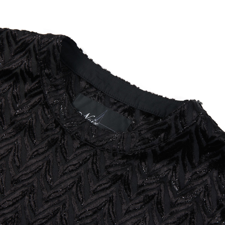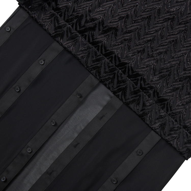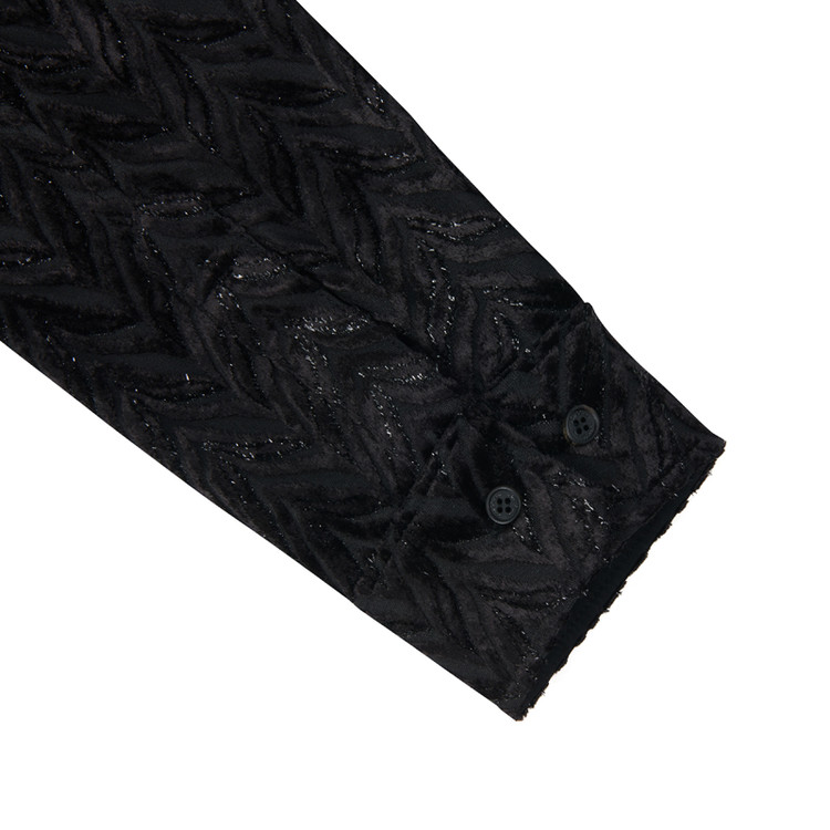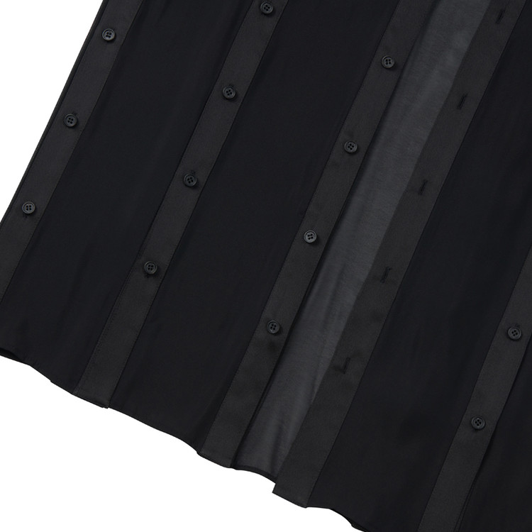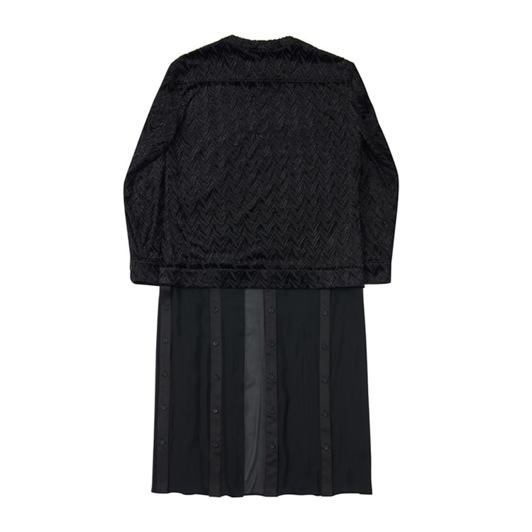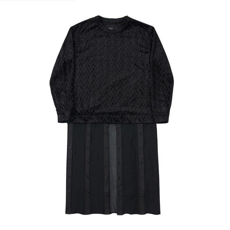 페이크 레이어드 디테일이 가미된 롱 셔츠 제품으로 글리터와 쉬폰 소재의 배합이 특징이다.